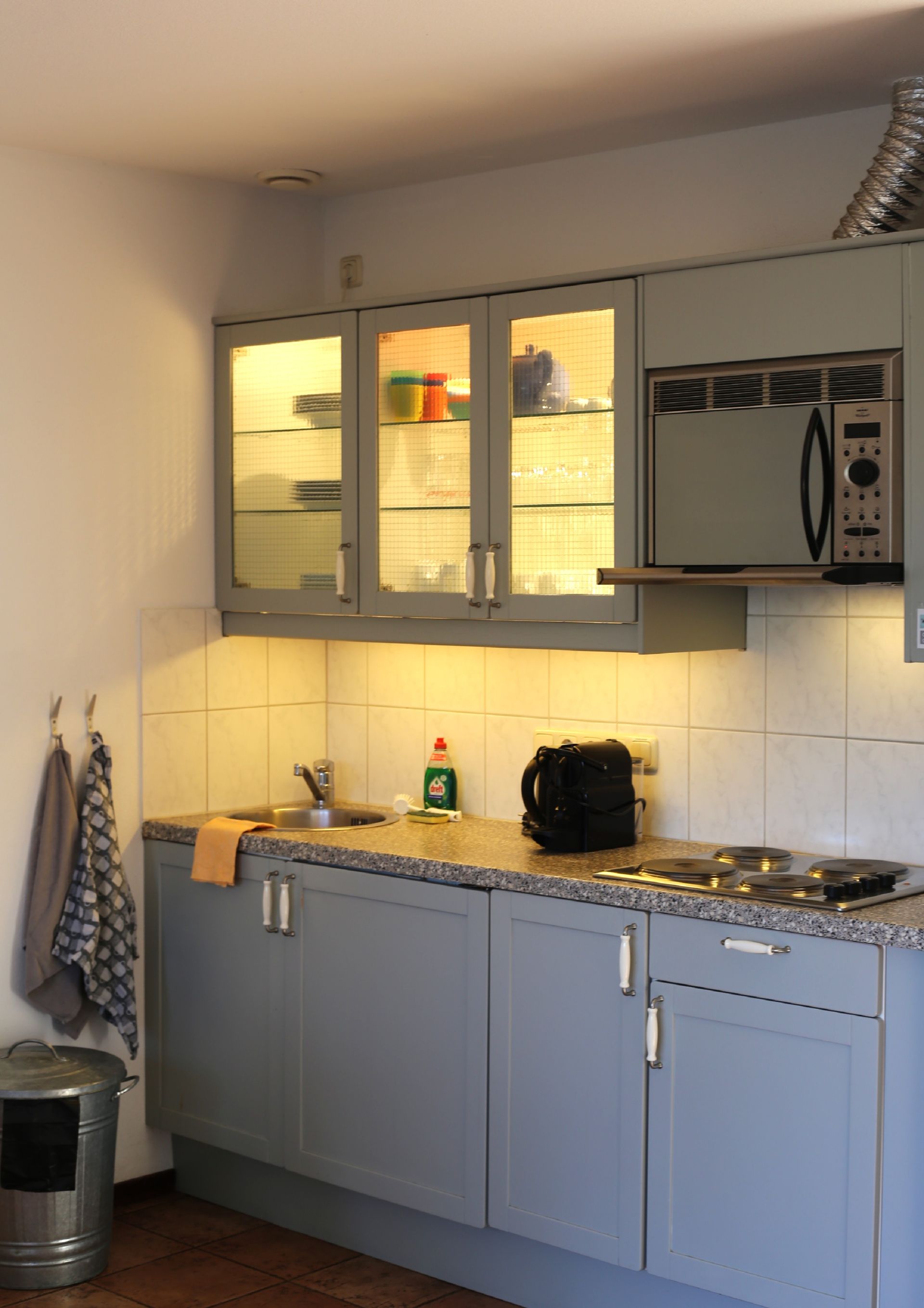 - open keuken met koelkast (zonder vriesvak), Nespresso, waterkoker, koffiezetfilterapparaat, magnetron (zonder ovenfunctie), kleine compacte vrijstaande oven, elektrische kookplaat of inductie, afwasteiltje, afdruiprek, keukengerei, glaswerk en porselein.