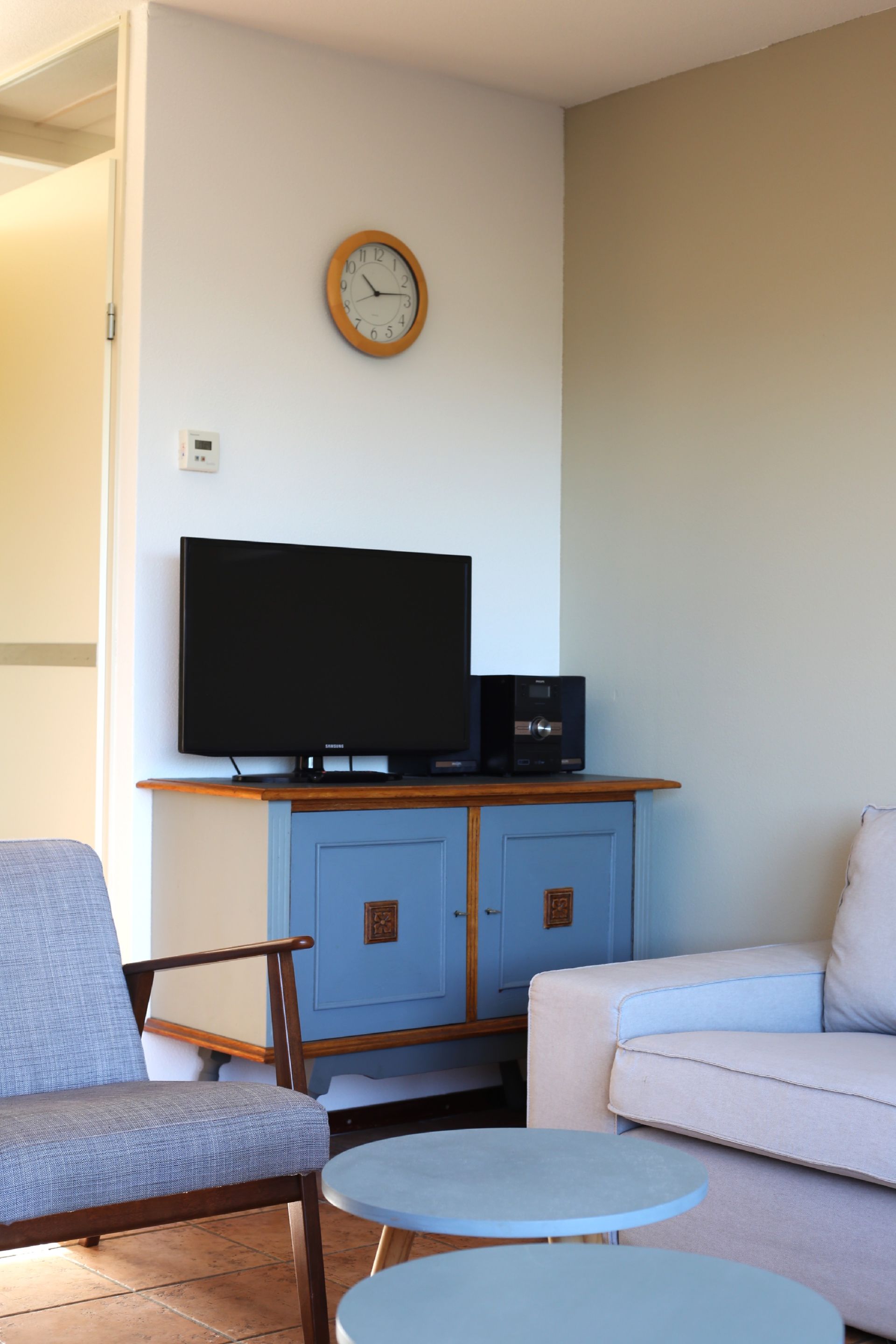 - woonkamer met zitgelegenheid, salontafeltje, televisie, radio-/cd-speler, woonkamerberging